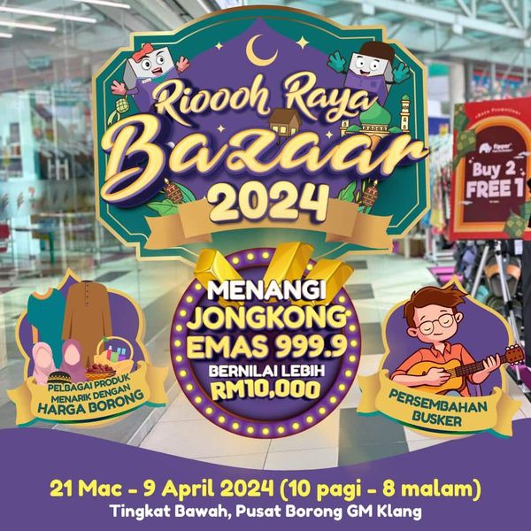 Pengurus Kanan Komunikasi Jenama GM Klang Norsuhaida Othman berkata Rioooh Raya Bazaar 2024 yang menampilkan lebih 40 reruai dengan pelbagai produk seperti baju raya untuk seisi keluarga, tudung, kuih, barangan dekorasi dan kelengkapan rumah, pewangi serta pelbagai barangan lain itu dibuka bermula hari ini hingga 9 April depan.
