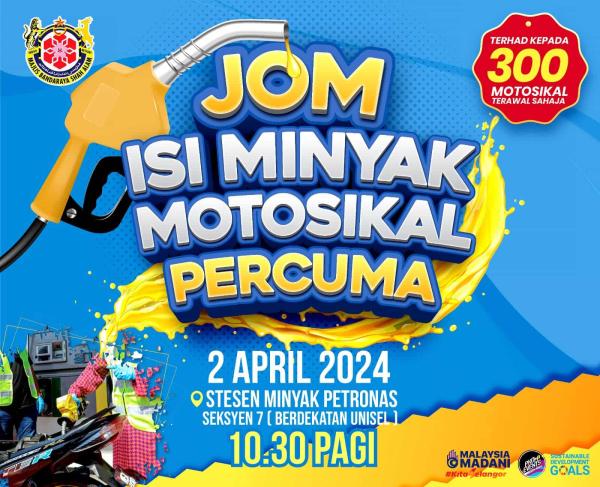 Majlis Bandaraya Shah Alam (MBSA) memaklumkan program Jom Isi Minyak Motosikal Percuma itu bermula 10.30 pagi di stesen minyak Petronas Seksyen 7 bersebelahan Universiti Selangor (Unisel) di sini.