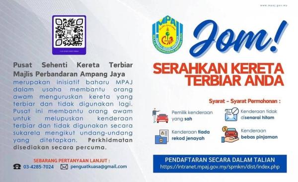 SHAH ALAM, 4 APRIL: Pemilik kenderaan usang dan terbiar dipelawa menghantar aset mereka ke pusat sehenti kereta terbiar yang disediakan Majlis Perbandaran Ampang Jaya (MPAJ).