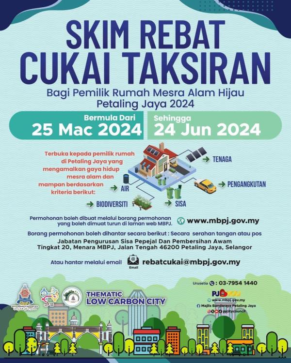 SHAH ALAM, 18 APRIL: Majlis Bandaraya Petaling Jaya (MBPJ) menawarkan skim rebat cukai taksiran kepada pemilik kediaman yang mengamalkan gaya hidup mesra alam dan mampan.