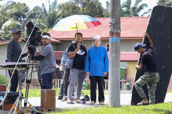 Datuk Ahmad Tarmimi Siregar (depan) bersama EXCO Kebudayaan Borhan Aman Shah (belakang, kanan) menjalani penggambaran telefilem "Ayah Panggil Balik' di Surau Darul Nur, Kuala Langat pada 30 Januari 2024. FIKRI YUSOF/SELANGORKINI[/caption]