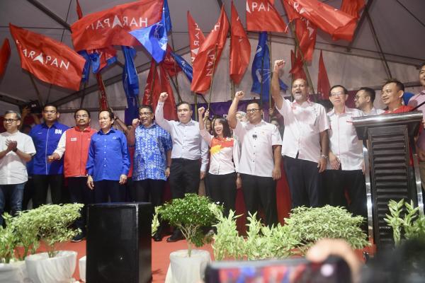 Calon Pilihan Raya Kecil (PRK) Dewan Undangan Negeri (DUN) Kuala Kubu Baharu Pang Sock Tao (tengah) pada majlis pengumuman calon di Pusat Khidmat DUN Kuala Kubu Baharu pada 24 Februari 2024. Foto MOHD KHAIRUL HELMY MOHD DIN/SELANGORKINI[/caption]