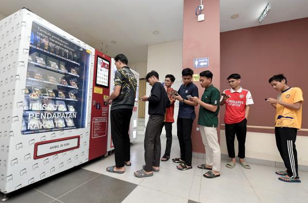 Peserta Program Layan Diri Inisiatif Pendapatan Rakyat (IPR) Mohd Hermi Shahuddin bersama mesin IPR yang diletakan di Kolej Angsana 2 UiTM Cawangan Selangor Kampus Puncak Alam pada 25 April 2024. Foto BERNAMA[/caption]