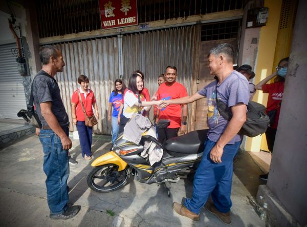 Calon Kerajaan Perpaduan Pang Sock Tao (tengah) beramah mesra bersama orang ramai pada Walkabout disekitar pekan Kerling, Kuala Kubu Bharu pada 02 Mei 2024. Foto MOHD KHAIRUL HELMY MOHD DIN/SELANGORKINI