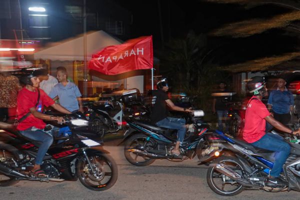 Penyokong Pakatan Harapan (HARAPAN) mengibarkan bendera HARAPAN ketika Grand Finale Ceramah Mega Perpaduan PRK Kuala Kubu Baharu di Stadium Mini Kuala Kubu Bharu, Hulu Selangor pada 9 Mei 2024. Foto HAFIZ OTHMAN/SELANGORKINI