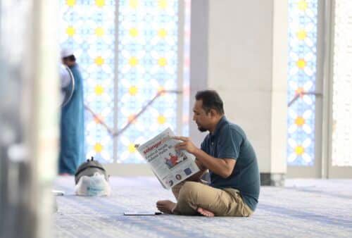 Seorang pengunjung membaca akhbar Selangorkini ketika menunggu bekas Mufti Besar Mesir Prof Dr Ali Jum’ah Muhammad Abdul Wahab mengupas kitab hadis 40 karya Imam An Nawawi sempena Festival Turath Islami Selangor di Masjid Sultan Salahuddin Abdul Aziz Shah pada 27 mei 2024. Foto NUR ADIBAH AHMAD IZAM/SELANGORKINI