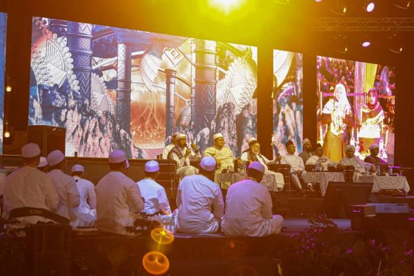 Perdana Menteri Datuk Seri Anwar Ibrahim (tengah) bersama Dato' Menteri Besar Selangor Dato' Seri Amirudin Shari (tiga, kanan) dan Bekas Mufti Agung Negara Mesir Al-Imam Al-Allamah Prof De Ali Jum'ah (tiga, kiri) ketika hadir ke Mawlid Akbar Darul Ehsan Berselawat di Dataran Tapak Karnival Perkarangan Stadium, Shah Alam pada 2 Jun 2024. Foto HAFIZ OTHMAN/SELANGORKINI