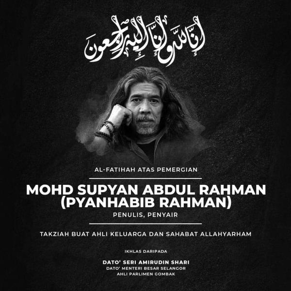 SHAH ALAM, 5 JUN: Dato' Menteri Besar Dato' Seri Amirudin Shari menganggap pemergian penyair dan pelakon Mohd Supyan Abdul Rahman sebagai kehilangan buat negara.
