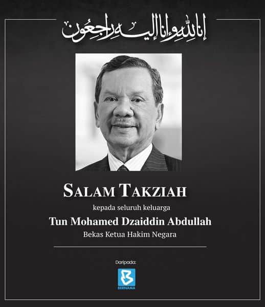 KUALA LUMPUR, 11 JULAI: Bekas Ketua Hakim Negara Tun Mohamed Dzaiddin Abdullah meninggal dunia pada usia 86 tahun di Hospital Prince Court malam ini.
