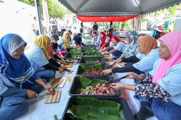 Tiga penduduk melapah daging lembu dalam aktiviti Rewang Komuniti Strata di Shah Alam pada 8 Jun. Acara dua hari itu dimeriahkan dengan sukaneka, majlis berendoi dan kenduri rakyat[/caption]