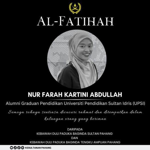 Menurut hantaran di laman Facebook Kesultanan Pahang, baginda berdua turut mendoakan agar roh Nur Farah Kartini yang juga alumni Universiti Pendidikan Sultan Idris (UPSI) ditempatkan bersama-sama orang yang beriman.