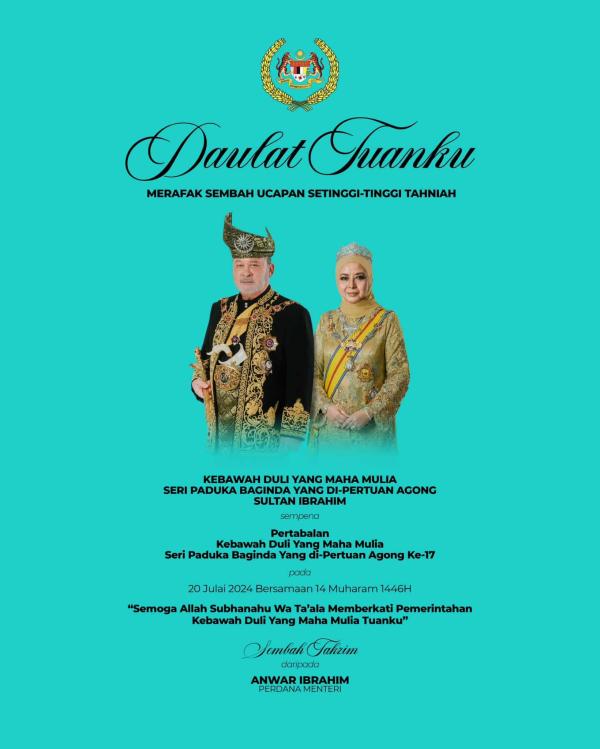 KUALA LUMPUR, 20 JULAI: Perdana Menteri Datuk Seri Anwar Ibrahim merafak sembah tahniah kepada Yang di-Pertuan Agong Sultan Ibrahim sempena Istiadat Pertabalan yang berlangsung hari ini.