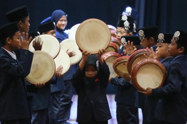 Murid Sekolah Kebangsaan Permatang Pasir, Kuala Langat membuat persembahan kompang ketika majlis penutupan rasmi Pertandingan Debat Darul Ehsan Piala Speaker Dewan Negeri Selangor (DNS) di Dewan Jubli Perak Bangunan Sultan Abdul Aziz, Shah Alam pada 25 Jualai 2024. Foto FIKRI YUSOF/MEDIA SELANGOR