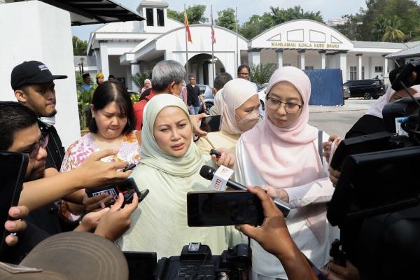 Sepupu arwah Nur Farah Kartini Abdullah, Suzur Sofia Smeth (kiri) bercakap kepada media selepas meninggalkan pekarangan Mahkamah Majistret Kuala Kubu Bharu selepas sebutan kes pembunuhan bekas penuntut Universiti Pendidikan Sultan Idris (UPSI) pada 26 Julai 2024. Foto REMY ARIFIN/MEDIA SELANGOR