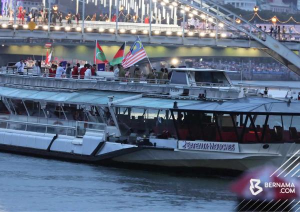 Pembawa Jalur Gemilang, Bertrand Rhodict Lises dan Nur Shazrin Mohamad Latif bersama atlet dan pegawai kontinjen Malaysia ketika upacara pembukaan Sukan Olimpik Paris 2024 di Sungai Seine pada 27 Julai 2024. Foto Facebook Bernama[/caption]
