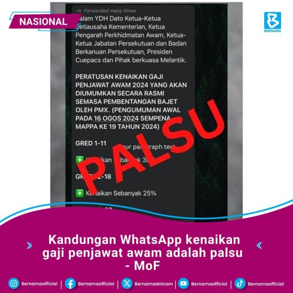 KUALA LUMPUR, 30 JULAI: Kementerian Kewangan (MoF) menafikan pihaknya mengeluarkan sebarang pesanan di aplikasi WhatsApp yang ditularkan berhubung kenaikan gaji penjawat awam pada 25 Julai, dan mengatakan bahawa ia adalah palsu.