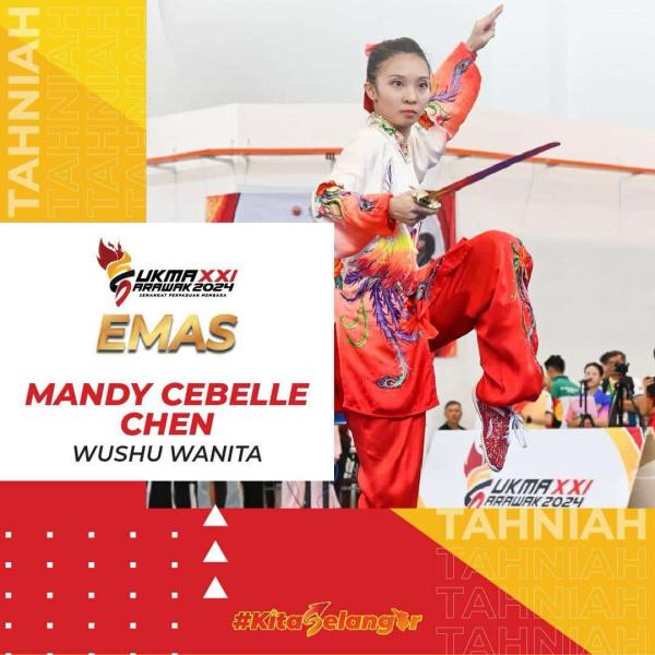 Mandy Cebelle Chen sekali lagi menyumbangkan pingat emas buat Kontinjen Negeri Selangor menerusi acara Wushu Toulu Taijiquan Wanita yang berlangsung di Dewan Wushu, Petra Jaya pada 15 Ogos 2024. Foto Facebook Majlis Sukan Negeri Selangor[/caption]