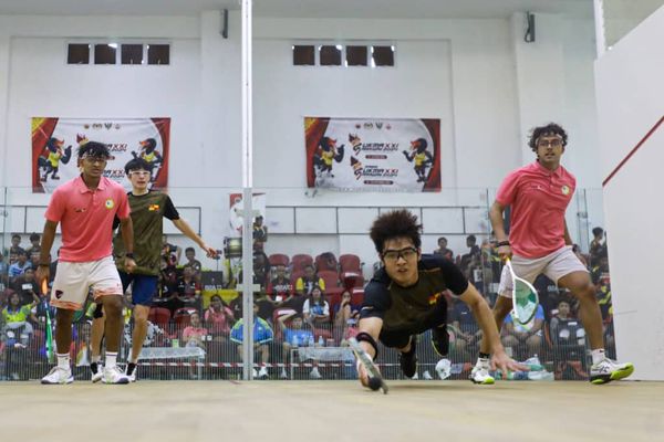 Atlet skuasy Selangor, Tay Jun Qian (dua kanan) dan Aidan Yunus (dua kiri) beraksi ketika suku akhir skuasy beregu lelaki terpaksa akur apabila tewas di tangan pasangan Pulau Pinang Ishant Shah dan R Dhirren pada Sukan Malaysia (SUKMA) 2024 di Pusat Squash Sarawak, Kuching pada 19 Ogos 2024. Foto HAFIZ OTHMAN/MEDIA SELANGOR
