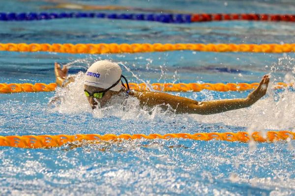 Atlet renang Selangor, Shun Qi Lim beraksi dalam acara 4x100 meter (m) rampaian campuran dan meraih pingat emas ketika Sukan Malaysia (SUKMA) 2024 di Pusat Akuatik Pandelela Rinong, Petra Jaya pada 20 Ogos 2024. Foto HAFIZ OTHMAN/MEDIA SELANGOR