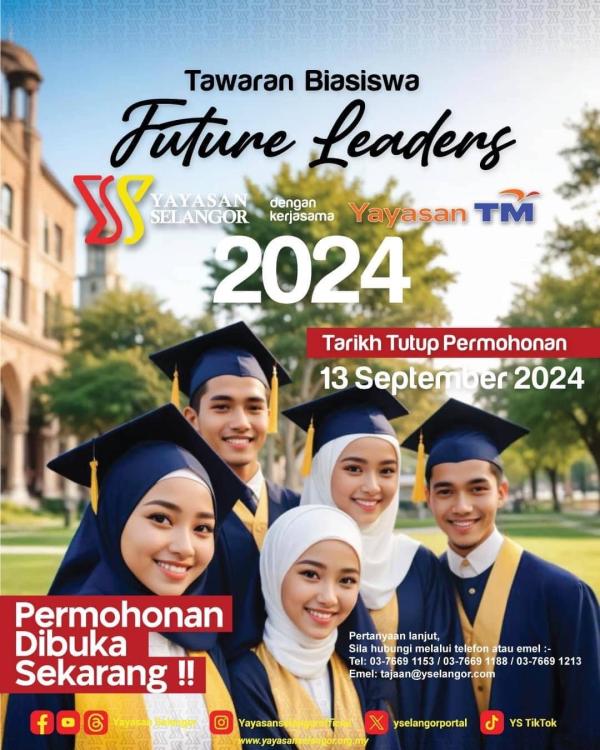 “Tawaran biasiswa Future Leaders Yayasan Telekom Malaysia dengan kerjasama Yayasan Selangor 2024 dibuka sekarang. Tarikh tutup permohonan pada 13 September depan," katanya di Facebook.