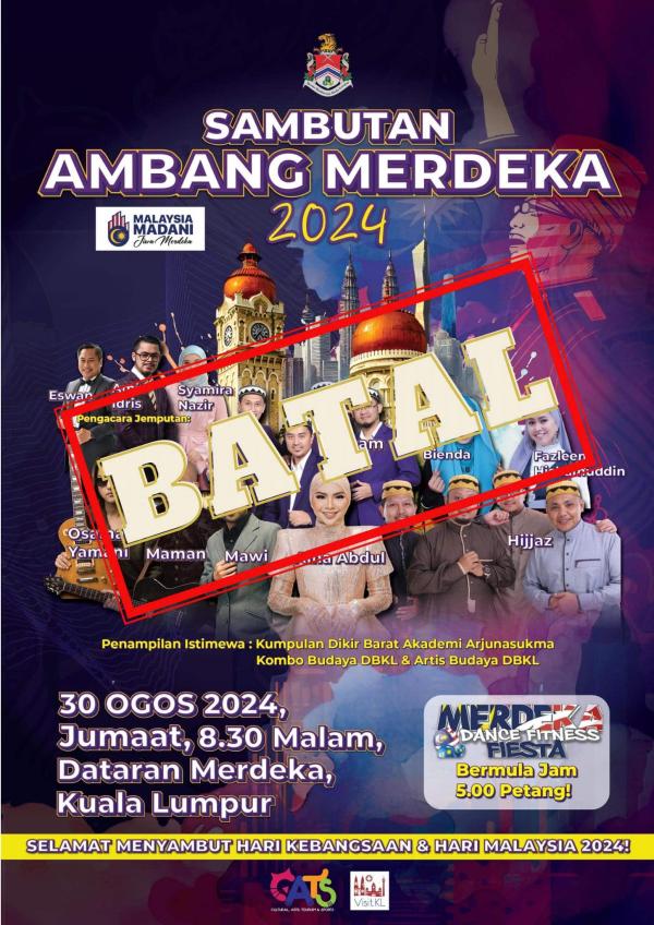 KUALA LUMPUR, 28 OGOS: Dewan Bandaraya Kuala Lumpur (DBKL) membatalkan sambutan Ambang Merdeka 2024 yang dijadual berlangsung di Dataran Merdeka esok.