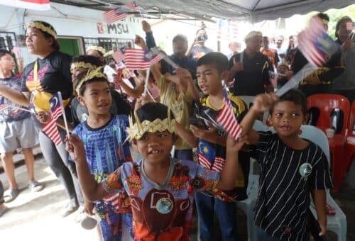 Kanak-kanak Orang Asli dari suku kaum Temuan mengibarkan Jalur Gemilang dalam program Karnival Kesihatan Bersama Orang Asli Kemensah di Dewan Orang Asli Kemensah, Ampang Jaya pada 31 Ogos 2024. Foto AHMAD ZAKKI JILAN/MEDIA SELANGOR