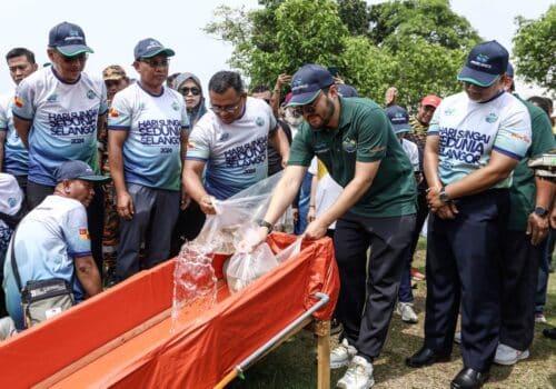 DYTM Raja Muda Selangor Tengku Amir Shah diiringi Dato' Menteri Besar Dato' Seri Amirudin Shari berkenan melepaskan ikan sebagai gimik perasmian Sambutan Hari Sungai Sedunia peringkat negeri Selangor di Taman Tasik Milenium, Kuala Kubu Bharu, Hulu Selangor pada 7 September 2024. Foto ZULFADHLI ZAKI/MEDIA SELANGOR