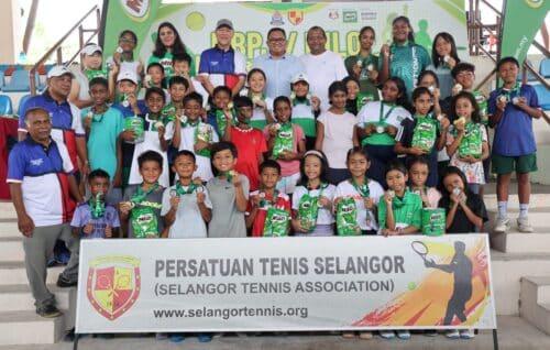 Timbalan Datuk Bandar Petaling Jaya Aznan Hassan (belakang, tengah) bersama pemenang dalam Kejohanan Tenis Remaja Terbuka MBPJ-Milo di Kompleks Sukan Kelana Jaya, Petaling Jaya pada 22 September 2024. Foto AHMAD ZAKKI JILAN/MEDIA SELANGOR