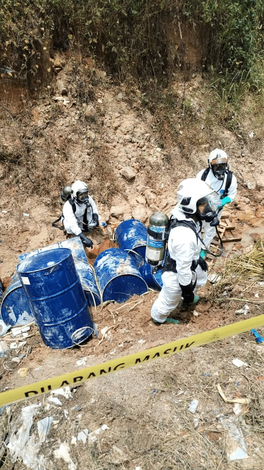 Beliau berkata Pasukan Khas Bahan Kimia Berbahaya (Hazmat) ketika ini masih dalam proses mengalihkan tong berkenaan dan Jabatan Alam Sekitar (JAS) telah mengambil sampel.