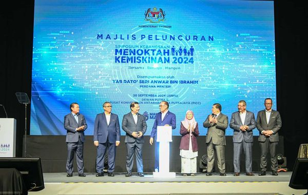 Perdana Menteri Datuk Seri Anwar Ibrahim ketika berucap merasmikan Simposium Kebangsaaan: Menokhtahkan Kemiskinan di Pusat Konvensyen Antarabangsa Putrajaya (PICC), pada 30 September 2024. Foto Facebook Anwar Ibrahim[/caption]