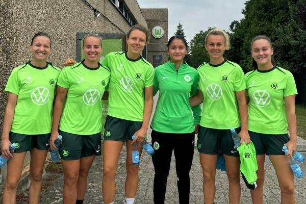 Pemain termuda Liga Super Wanita Persatuan Bola Sepak Selangor (FAS) Qaseh Rania Khairul Najib bergambar di pintu masuk pusat latihan VFL Wolfsburg ketika menjalani latihan bersama pasukan belia gergasi Eropah itu di Jerman baru-baru ini. Foto berkenaan dimuat naik di laman sesawang VFL Wolfsburg pada 9 September 2024[/caption]