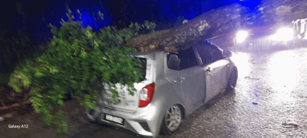 "Sebatang pokok tumbang dan menghempap kereta jenis Perodua Axia berhampiran Stesen LRT Taman Megah, Petaling Jaya.