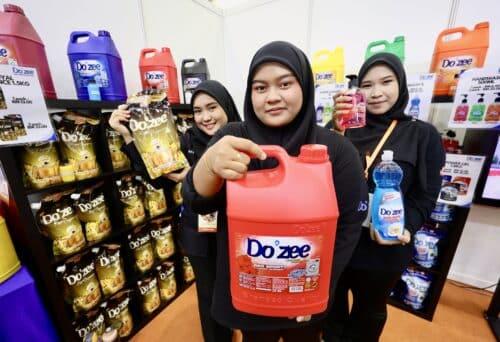 Dari kiri, Nazhariliya Shuhada Ahmad Suhaimi, Qatira Qirranie Ahmad Zaihom dan Nazatul Natasha Abdul Razak menunjukkan produk sabun Do’zee keluaran bumiputra ketika Ekspo Usahawan Selangor SELBIZ 2024 di Setia City Convention Centre pada 4 Oktober 2024. Foto NUR ADIBAH AHMAD IZAM/MEDIA SELANGOR