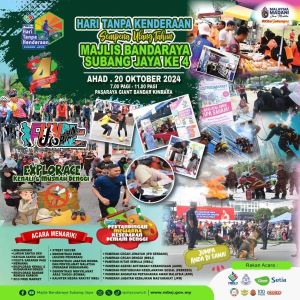 SHAH ALAM, 10 OKT: Majlis Bandaraya Subang Jaya (MBSJ) menganjurkan program hari tanpa kenderaan pada 20 Oktober ini sempena ulang tahun keempat diiktiraf bandar raya.