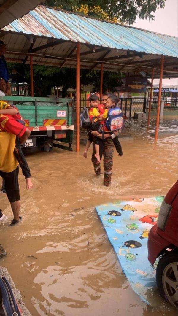 SHAH ALAM, 15 OKT: Seramai 21 kanak-kanak Tabika Kemas Klang Gate, Ampang serta empat guru yang terperangkap dalam banjir pagi tadi, diselamatkan pasukan bomba.