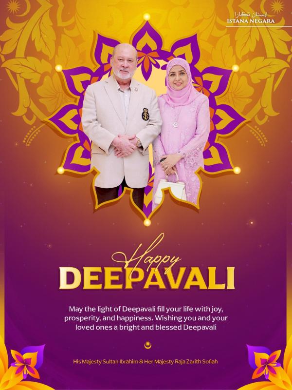 KUALA LUMPUR, 30 OKT: Yang di-Pertuan Agong Sultan Ibrahim dan Raja Permaisuri Agong Raja Zarith Sofiah menzahirkan ucapan selamat Deepavali kepada penganut Hindu di negara ini.