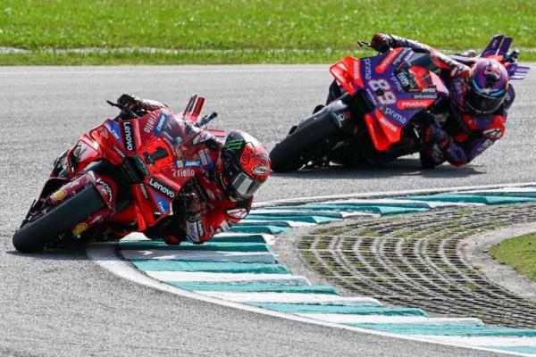 Saingan sengit antara pelumba Ducati Lenovo Team Francesco Bagnaia (kiri) dan pelumba Prima Pramac Racing Jorge Martin ketika perlumbaan Grand Prix Motosikal (MotoGP) Malaysia 2024 di Litar Antarabangsa Sepang pada 3 November 2024. Foto FIKRI YUSOF/MEDIA SELANGOR