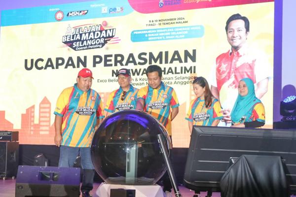 EXCO Belia dan Sukan Mohd Najwan Halimi melakukan gimik balingan dart ketika majlis perasmian Jelajah Belia Madani Selangor Daerah Petaling di Dewan Raja Muda Musa, Seksyen 7 Shah Alam pada 9 November 2024. Foto REMY ARIFIN/MEDIA SELANGOR[/caption]