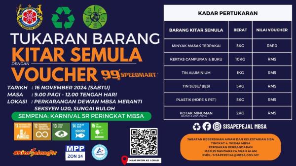 “Tukar barang kitar semula dengan baucar 99 Speedmart sempena karnival 5R peringkat MBSA,” maklum Jabatan Kebersihan Awam dan Kelestarian Sisa, Majlis Bandaraya Shah Alam (MBSA) di Facebook.