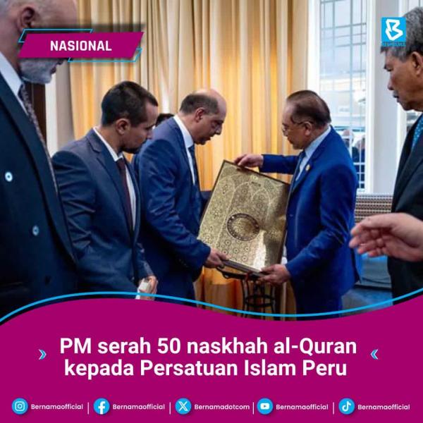 LIMA (Peru), 15 NOV: Perdana Menteri Datuk Seri Anwar Ibrahim hari ini menyerahkan 50 naskhah al-Quran cetakan khas dan terjemahan dalam Bahasa Sepanyol kepada Persatuan Islam Peru di sini.