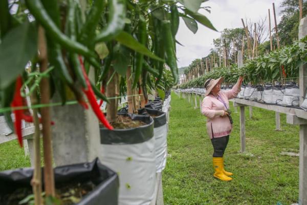 Wan Norsaiza Wan Hasnan, 51, memetik cili hasil Projek Fertigasi Cili Besar (Sakata 461) di bawah Inisiatif Pendapatan Rakyat, Inisiatif Usahawan Tani (IPR INTAN) di Pelangi Damansara, Petaling Jaya pada 18 November 2024. Foto FIKRI YUSOF/MEDIA SELANGOR