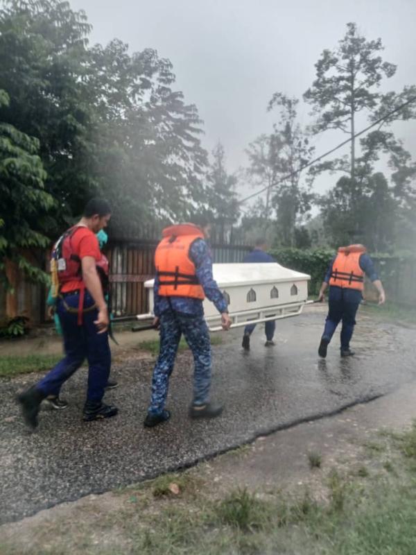 KUALA KRAI, 27 NOV: Jenazah warga emas dari Taman Sri Nal di sini terpaksa dibawa menggunakan bot Angkatan Pertahanan Awam (APM) sejauh satu kilometer untuk dikebumikan di Tanah Perkuburan Islam Batu Jong petang tadi berikutan kawasan penempatan itu dilanda banjir sejak semalam.