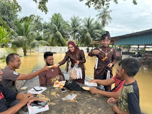 PASANGAN PENGANTIN EDAR MAKANAN KENDURI SELEPAS LOKASI MAJLIS DILANDA BANJIR