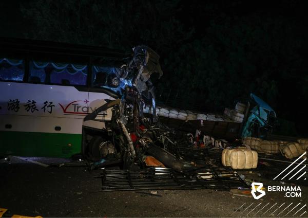 Kemalangan melibatkan bas persiaran, treler dan kenderaan pelbagai guna (MPV) di Lebuhraya Utara-Selatan (Plus) arah utara, berhampiran kawasan Rehat dan Rawat (R&R) Ayer Keroh pada 23 Disember 2024. Foto Facebook BERNAMA[/caption]