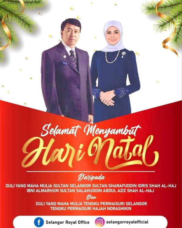SHAH ALAM, 25 DIS: Duli Yang Maha Mulia (DYMM) Sultan Selangor dan DYMM Tengku Permaisuri Selangor menzahirkan ucapan Selamat Hari Natal kepada penganut Kristian di seluruh negara.