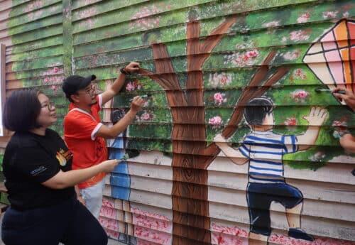 Ketua Pegawai Eksekutif Tourism Selangor Chua Yee Ling (kiri) melihat pelukis Sky Yong menyiapkan lukisan mural selepas sidang media di Kampung Baru Jenjarom, Kuala Langat pada 12 Januari 2025. Foto AHMAD ZAKKI JILAN/MEDIA SELANGOR
