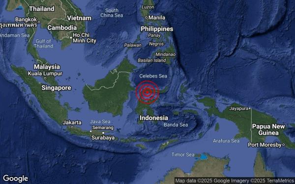 Menurut MetMalaysia, gempa bumi sederhana pada kedalaman 80 kilometer itu berlaku pada koordinat 0.5 darjah utara dan 121.2 darjah timur.
