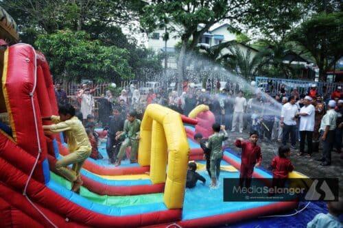 EXCO Belia, Sukan dan Keusahawanan Najwan Halimi (kanan) menyembur air kepada peserta Khatan Perdana pada Program Karnival Kesihatan DUN Kota Anggerik 2025 di Surau Al-Ansor, Seksyen 2, Shah Alam pada 02 Februari 2025. Foto MOHD KHAIRUL HELMY MOHD DIN/MEDIASELANGOR