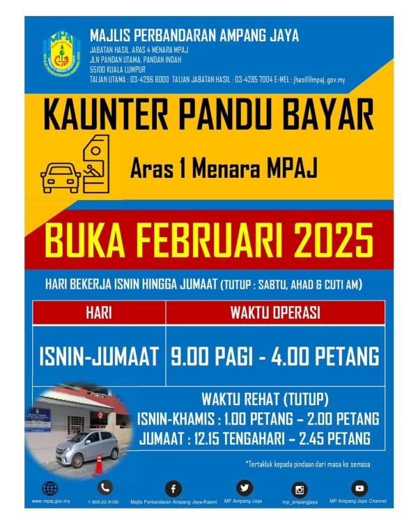 MPAJ menerusi kenyataan memaklumkan kaunter beroperasi setiap hari bekerja bermula jam 9 pagi hingga 4 petang (rehat 1 tengah hari) di kaunter pandu bayar aras 1, Menara MPAJ.