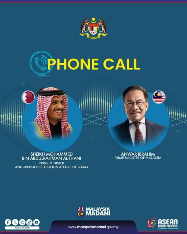 KUALA LUMPUR, 12 FEB: Perdana Menteri Datuk Seri Anwar Ibrahim telah menerima panggilan telefon daripada rakan sejawatannya dari Qatar Sheikh Mohammed Abdulrahman Al-Thani, mengenai situasi terkini di Gaza, lewat malam tadi.